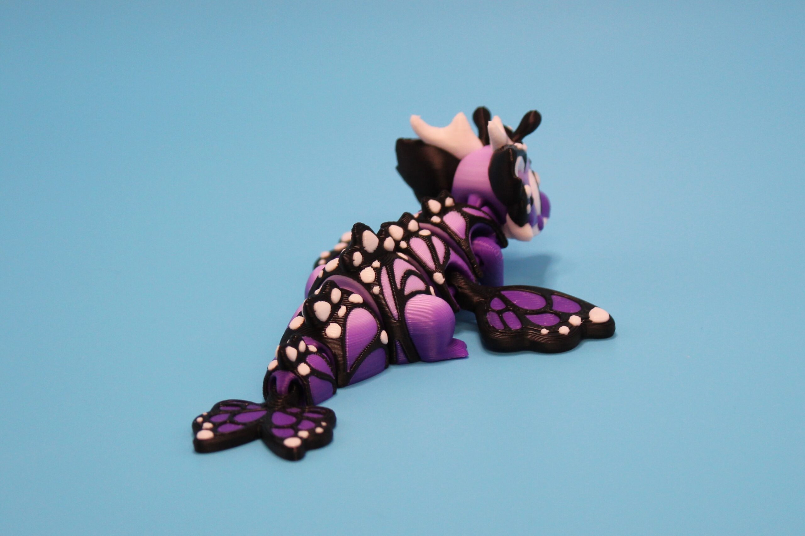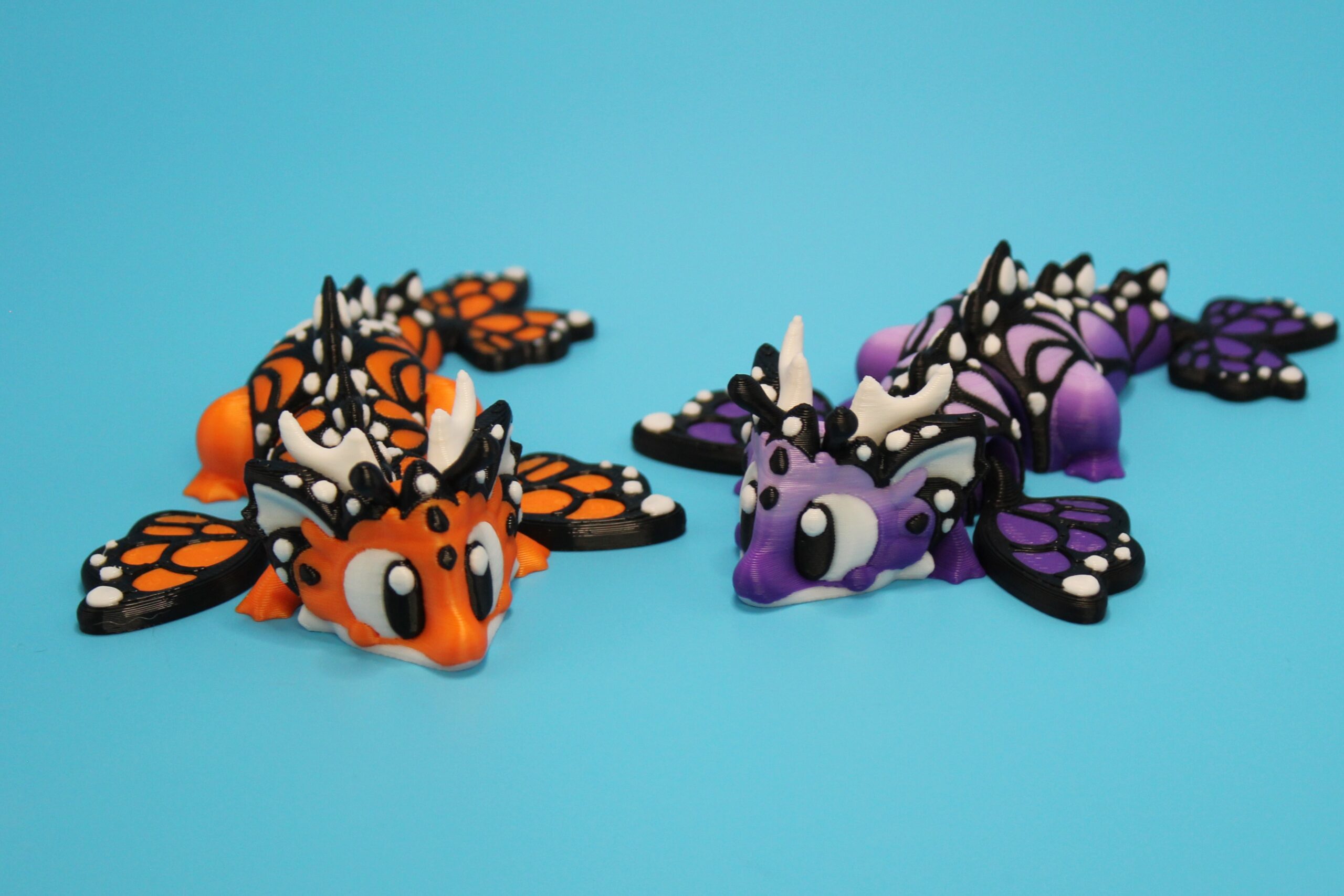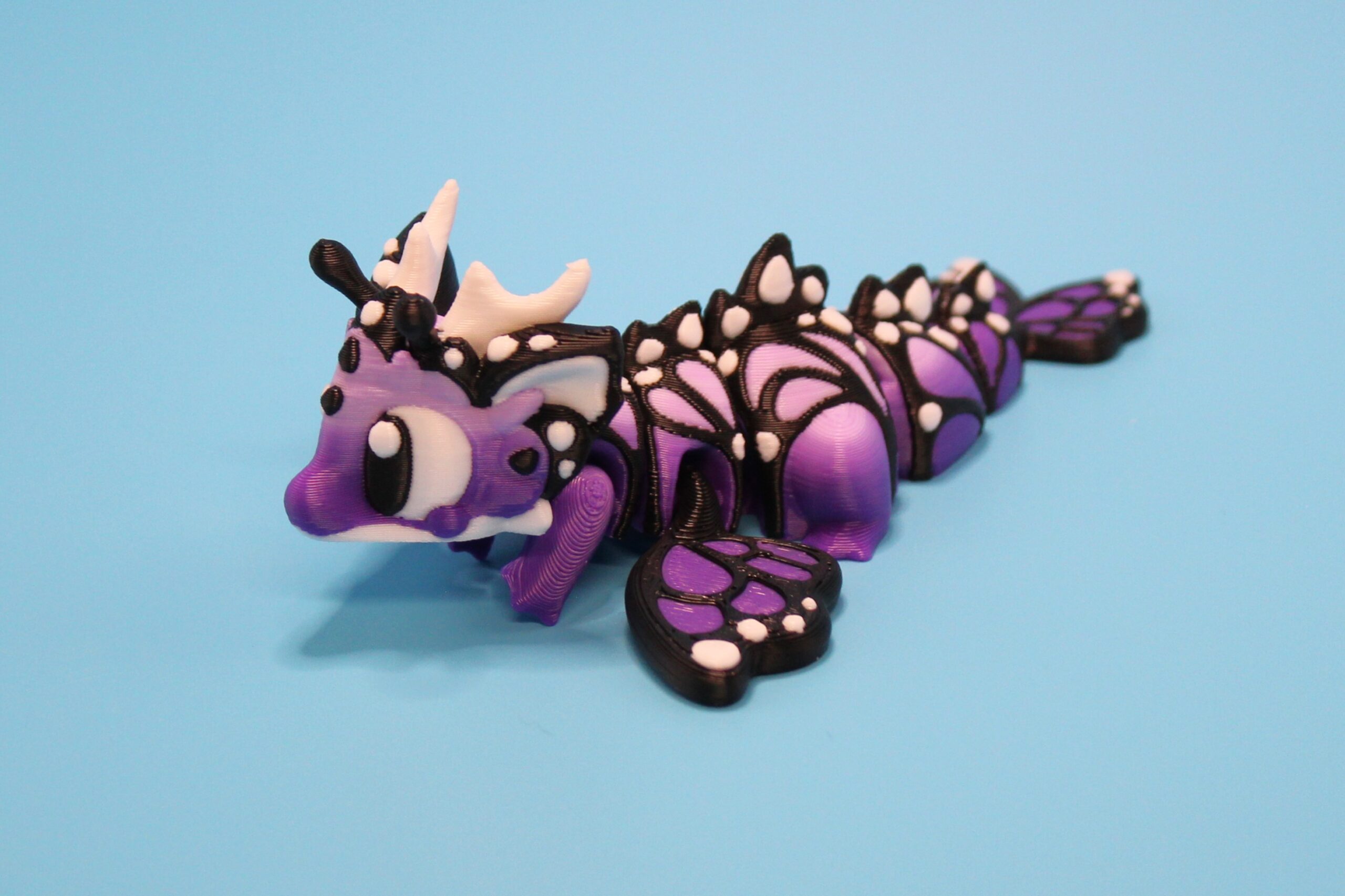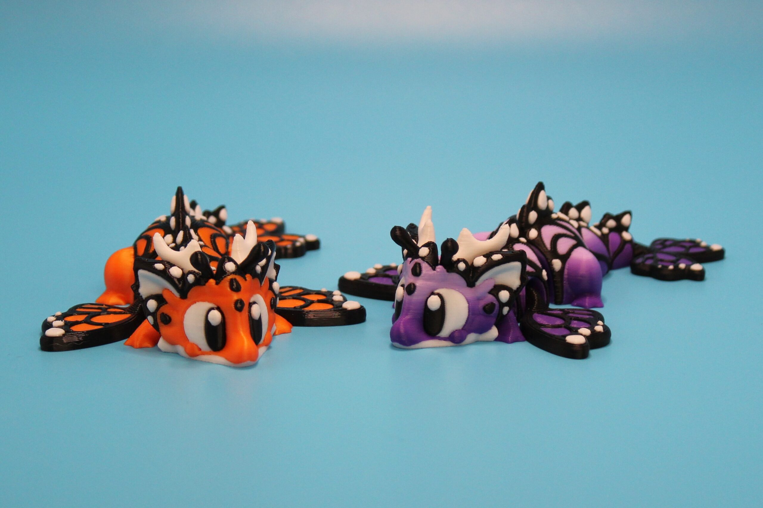 Introducing the ‘Butterfly’ Dragon by 3DGOB! These whimsical dragon figurines will add a touch of fantasy to any space. With their intricate design featuring orange and black butterfly-like wings, white horns, and expressive eyes, these dragons are sure to spark joy and wonder. Let these mythical creatures bring a smile to your face as they guard your desk, shelf, or any other spot in need of a magical touch. Get your hands on these delightful companions today! Now available in a new purple to lilac fade!