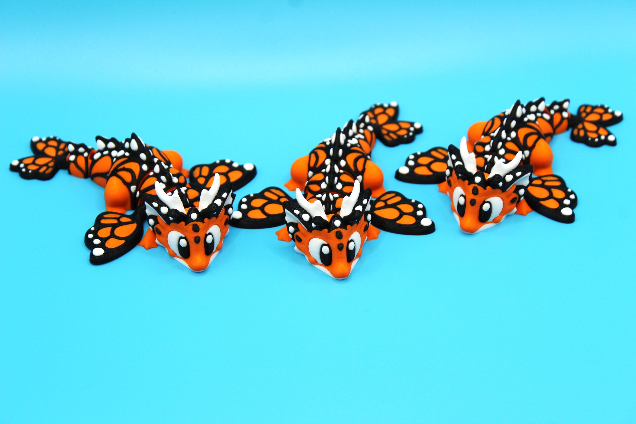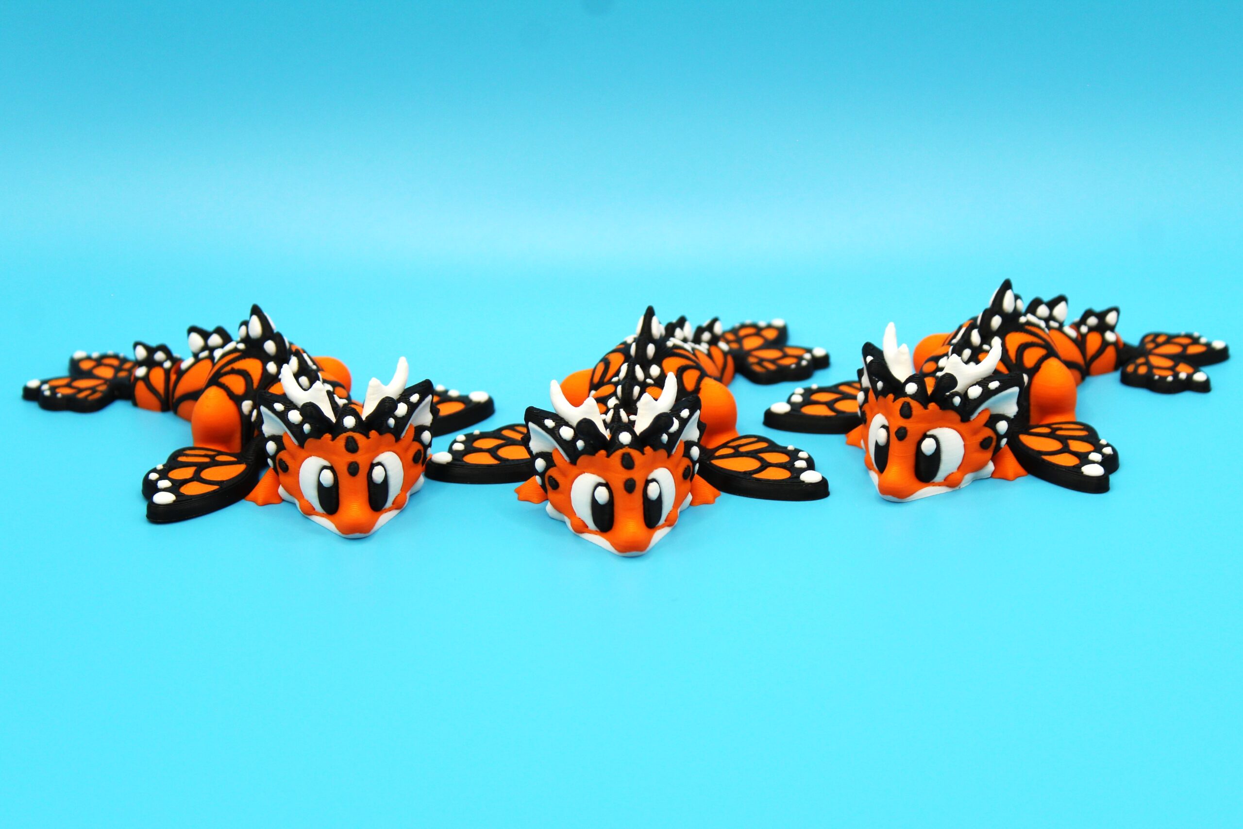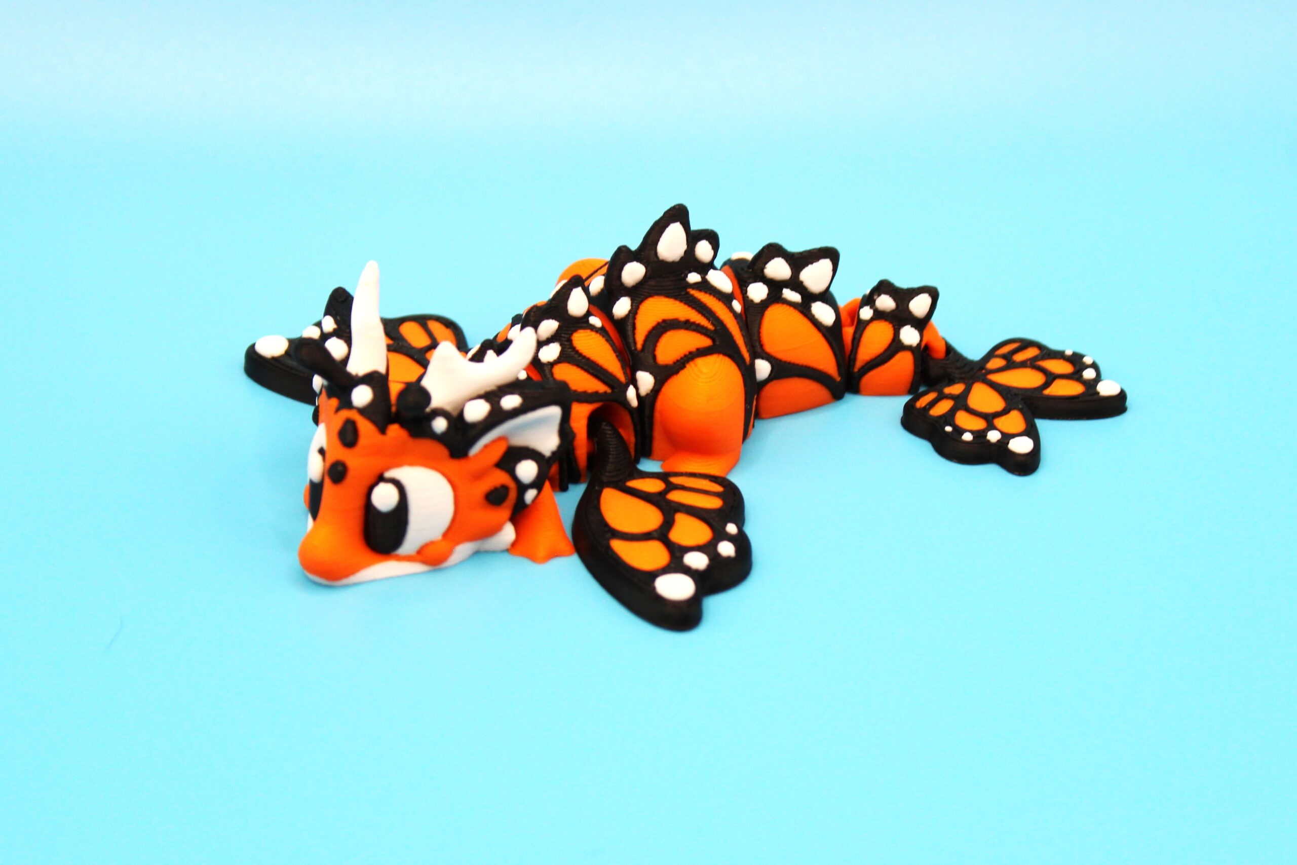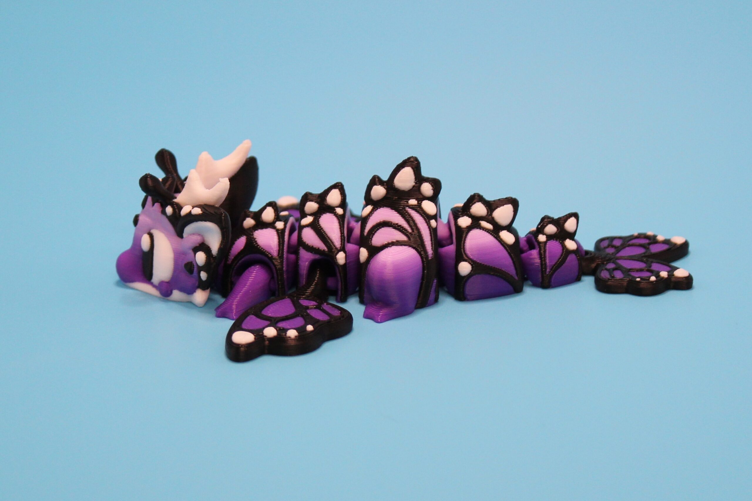 Introducing the ‘Butterfly’ Dragon by 3DGOB! These whimsical dragon figurines will add a touch of fantasy to any space. With their intricate design featuring orange and black butterfly-like wings, white horns, and expressive eyes, these dragons are sure to spark joy and wonder. Let these mythical creatures bring a smile to your face as they guard your desk, shelf, or any other spot in need of a magical touch. Get your hands on these delightful companions today! Now available in a new purple to lilac fade!