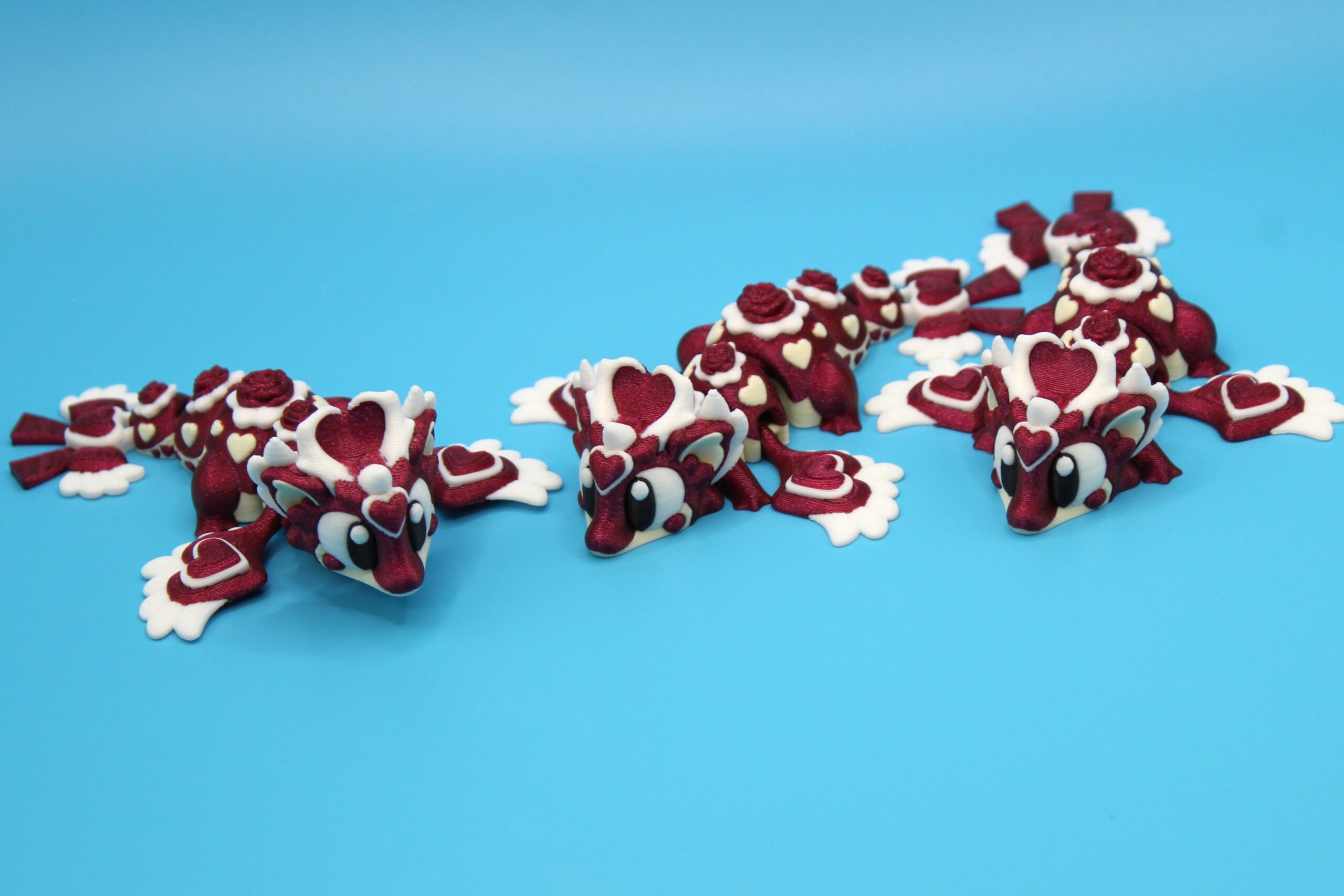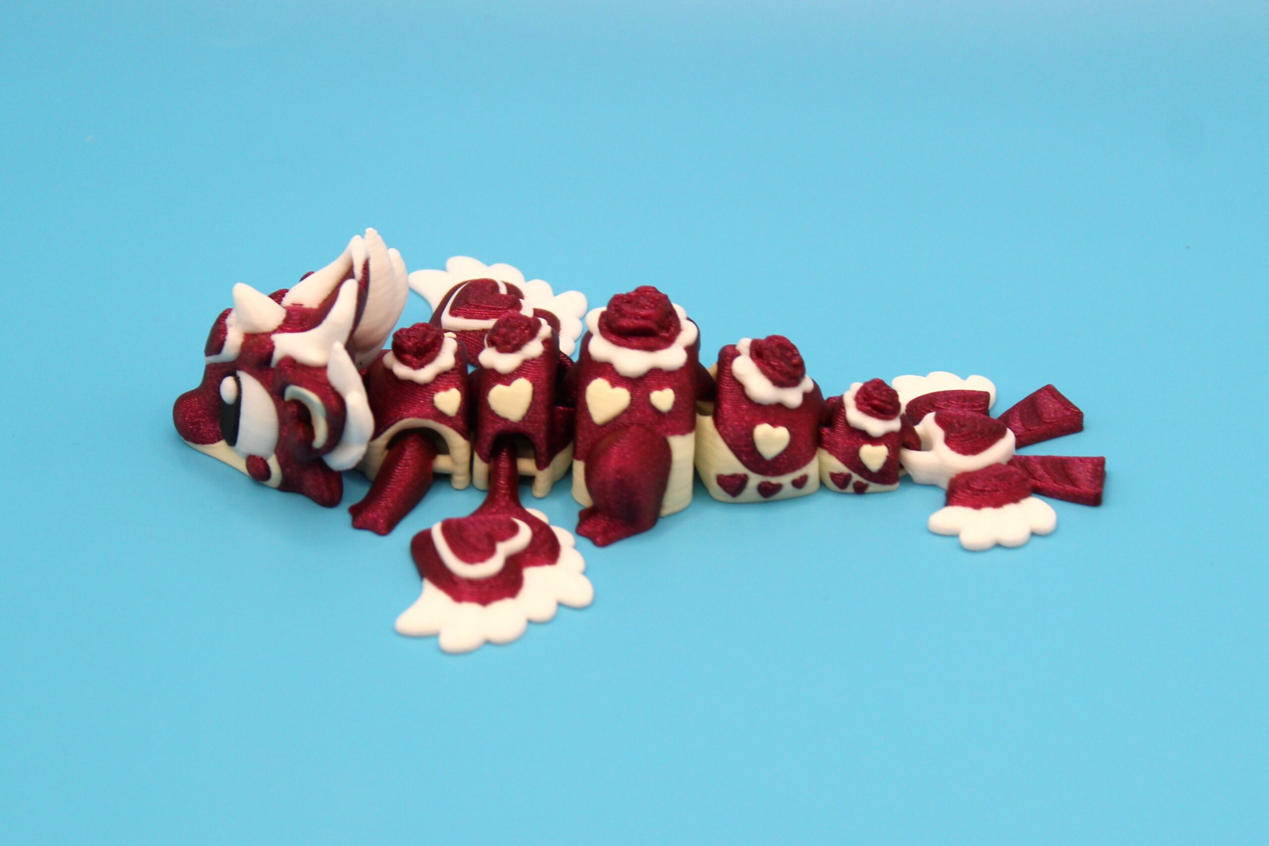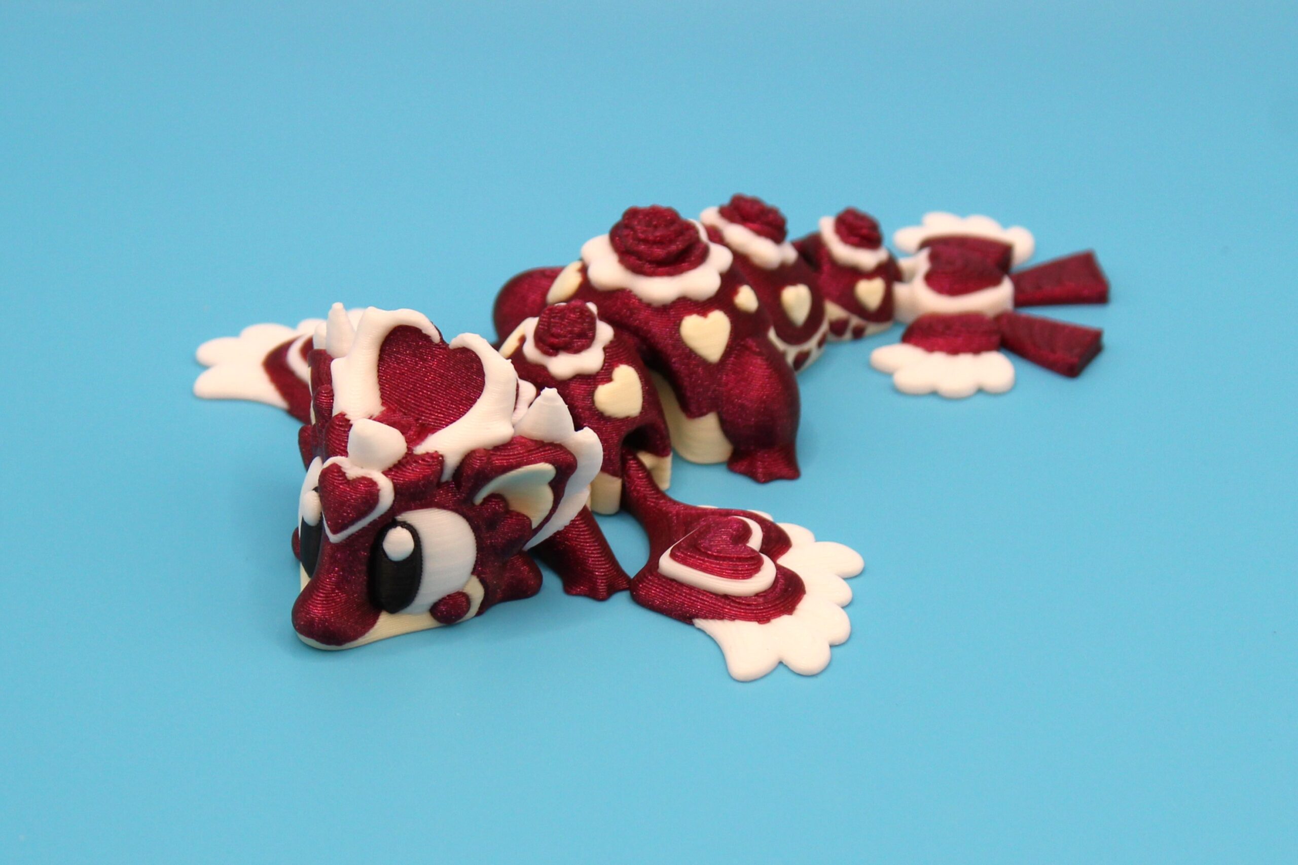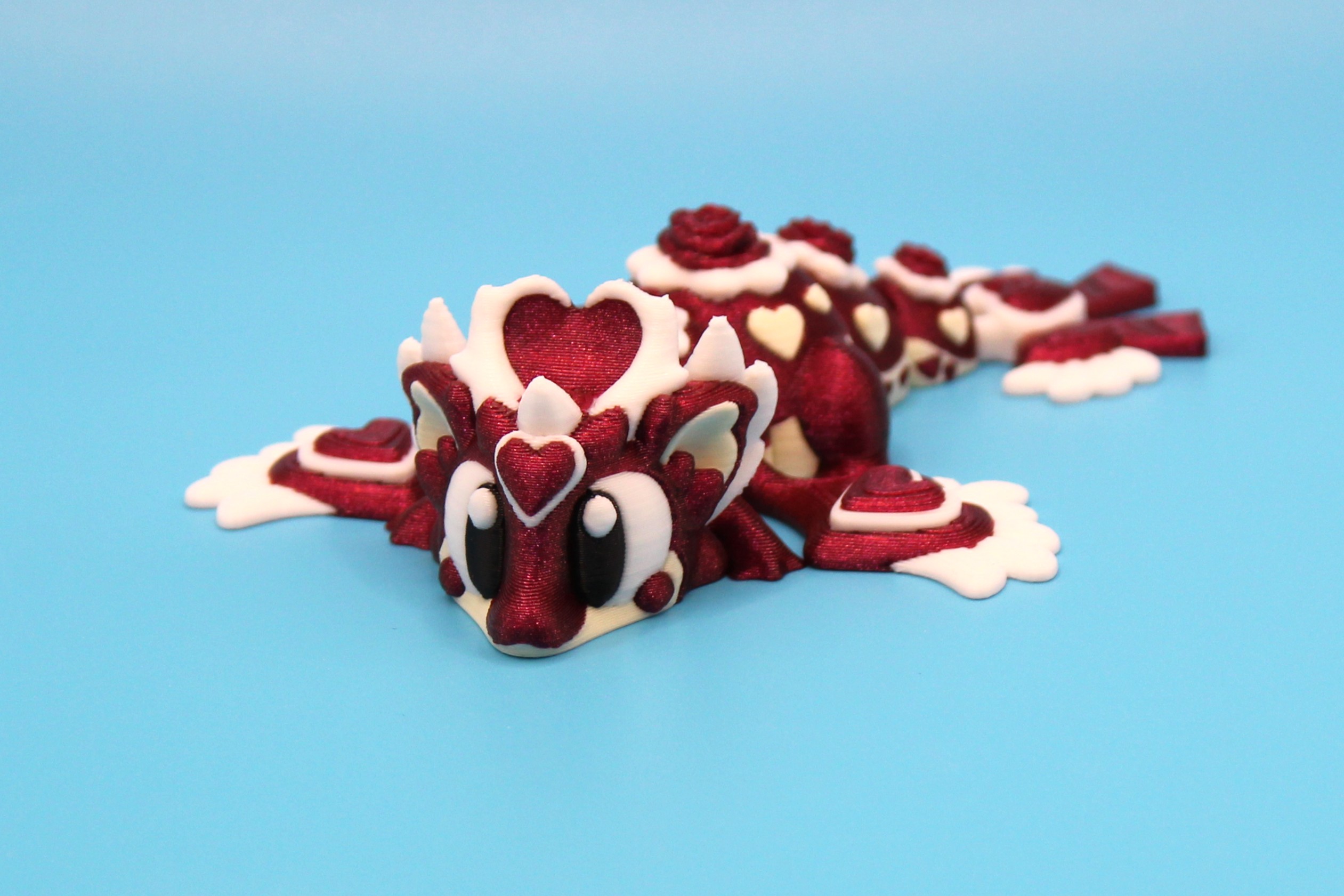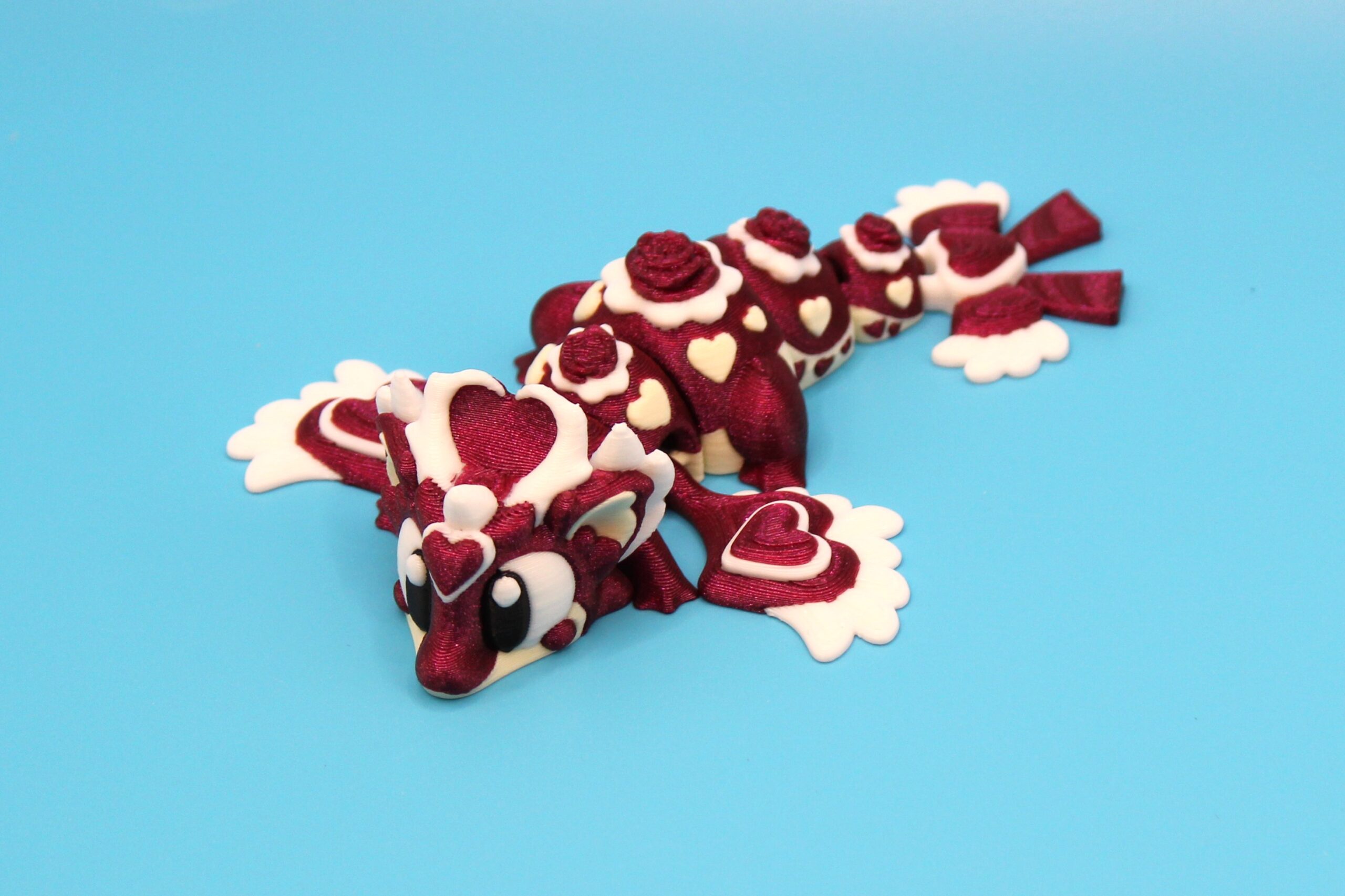 Introducing ‘Heart Seeker’ the Pocket Dragon by 3DGOB! This 3D-printed dragon figurine is bursting with love and personality, from its romantic eyes to it’s inlaid hearts and flowers on it’s body. You will fall in love with its beautiful silken red body to it’s cotton white underbelly. This little dragon would make the perfect ‘I Love You’ gift for those who are special in your life, and just in time for Valentines Day! Perfect for dragon lovers and fantasy enthusiasts alike, this quirky little creature is a must-have for your shelf or desk.