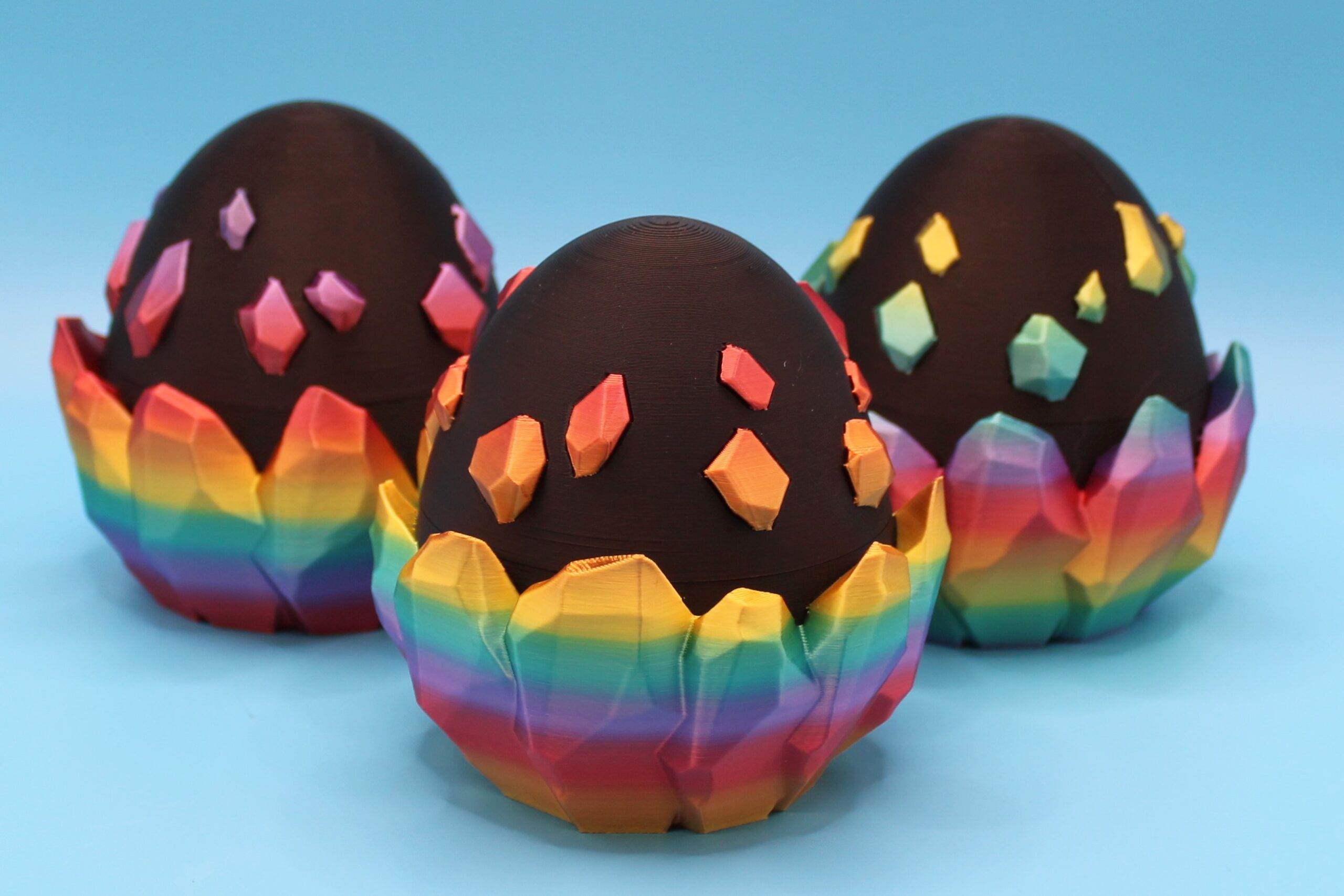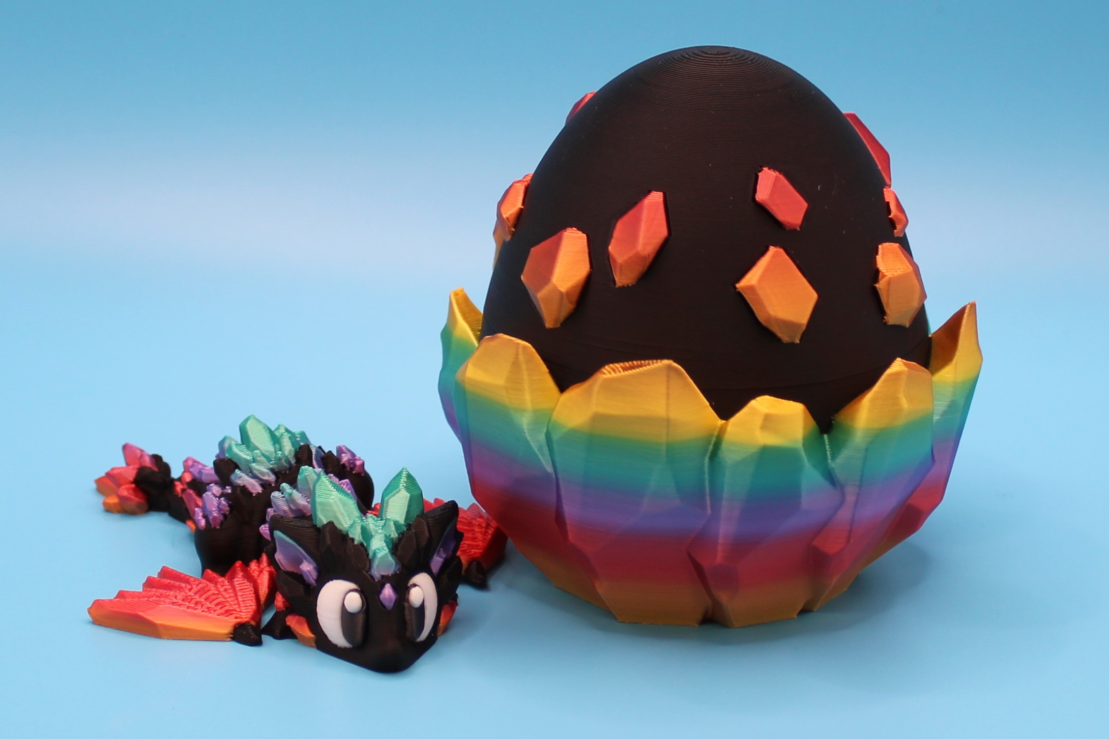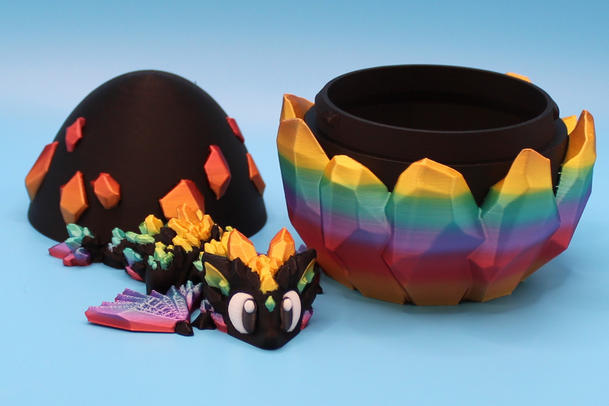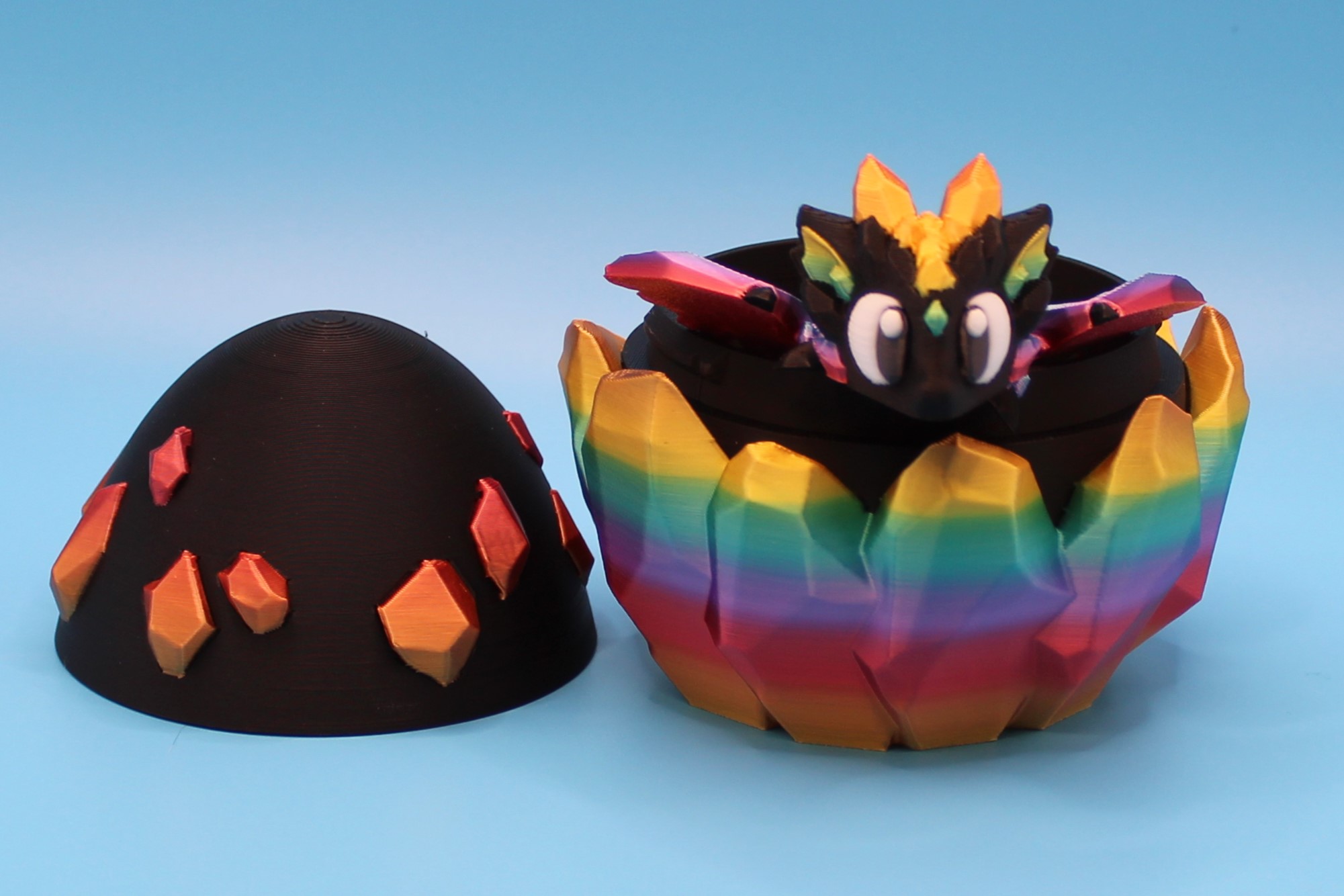 Introducing ‘Opal’ the Crystal Dragon by 3DGOB! This whimsical little dragon figure is sure to bring a touch of magic to your home or office. With its large, expressive eyes and vibrant colours, Opal is bound to capture the hearts of dragon lovers everywhere. The accompanying black egg adorned with opal crystals adds an extra touch of sparkle, making this a truly enchanting addition to any collection. We use a special rainbow filament in traditional opal colours and print in small batches, so every batch of eggs or dragons have a unique colour variation. So go ahead, let Opal breathe a little fire into your life!
