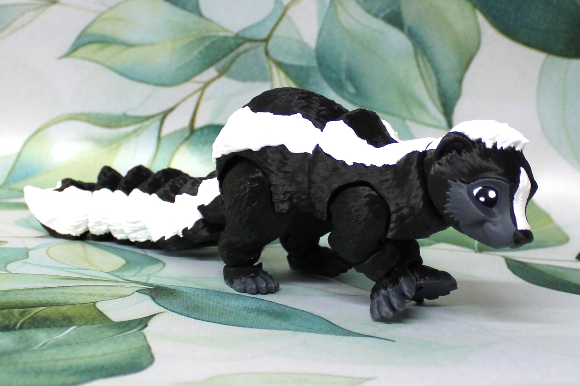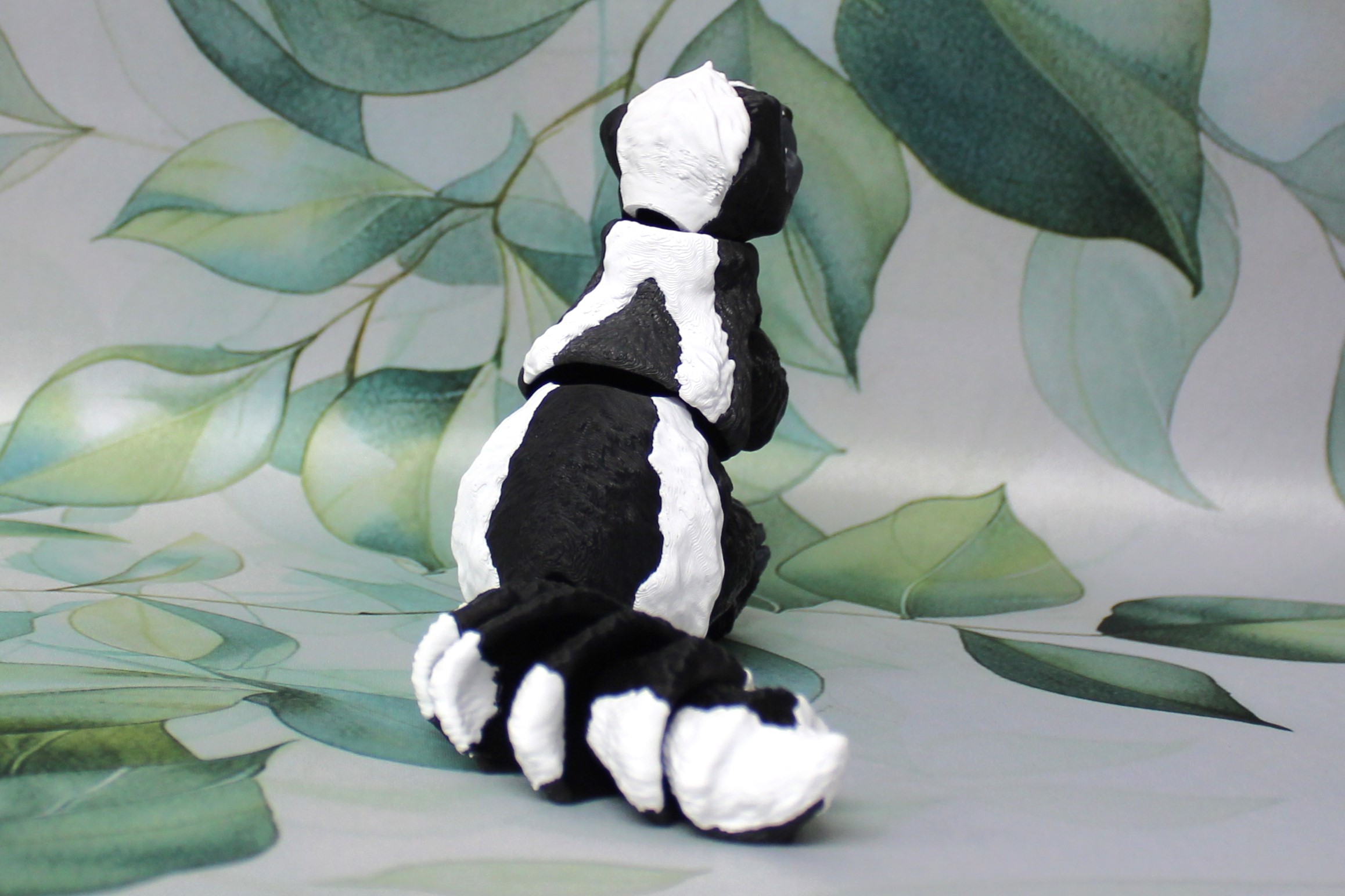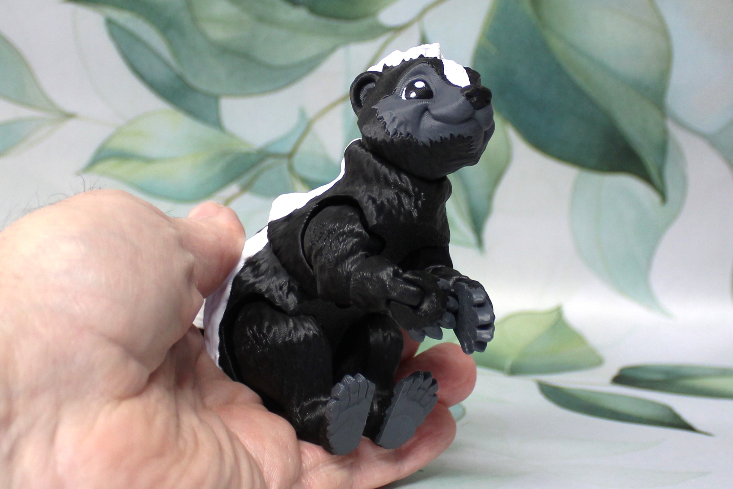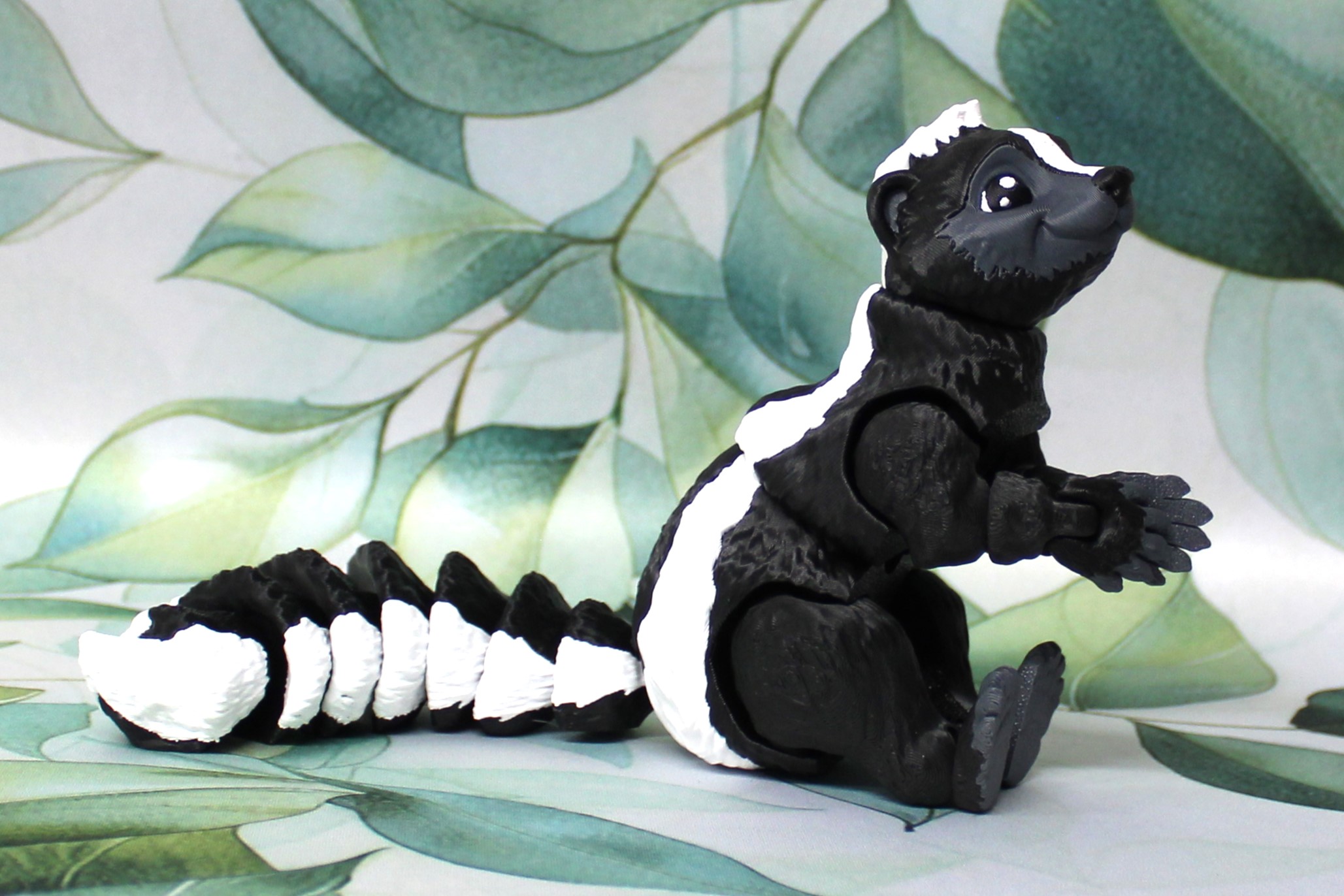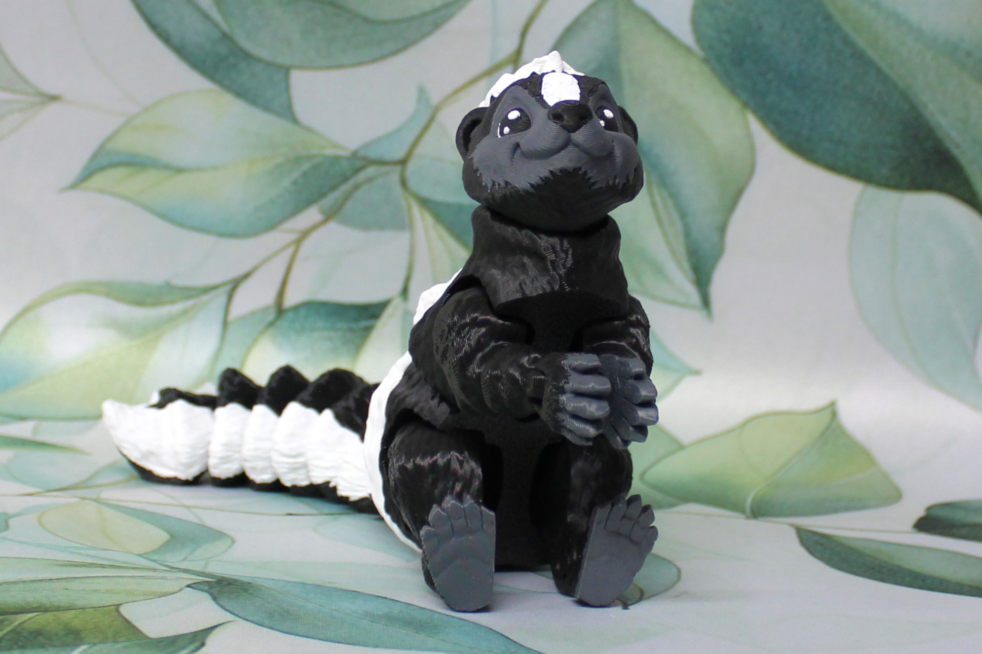 Introducing Skunk by MatMire Makes – the cutest addition to your collection! This small, black and white skunk figurine is guaranteed to make you smile with its big, expressive eyes. Perfect for animal lovers and collectors alike. Add a touch of whimsy to your décor with this adorable piece! Our little non stinky friend measures at 190mm long and 110mm high whilst sitting, but can be posed in various ways due to its articulated body, head, legs, and tail. Absolutely adorable!