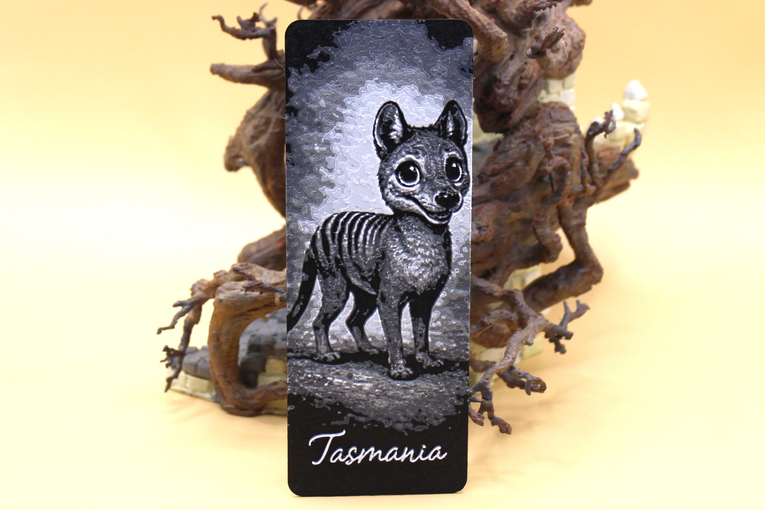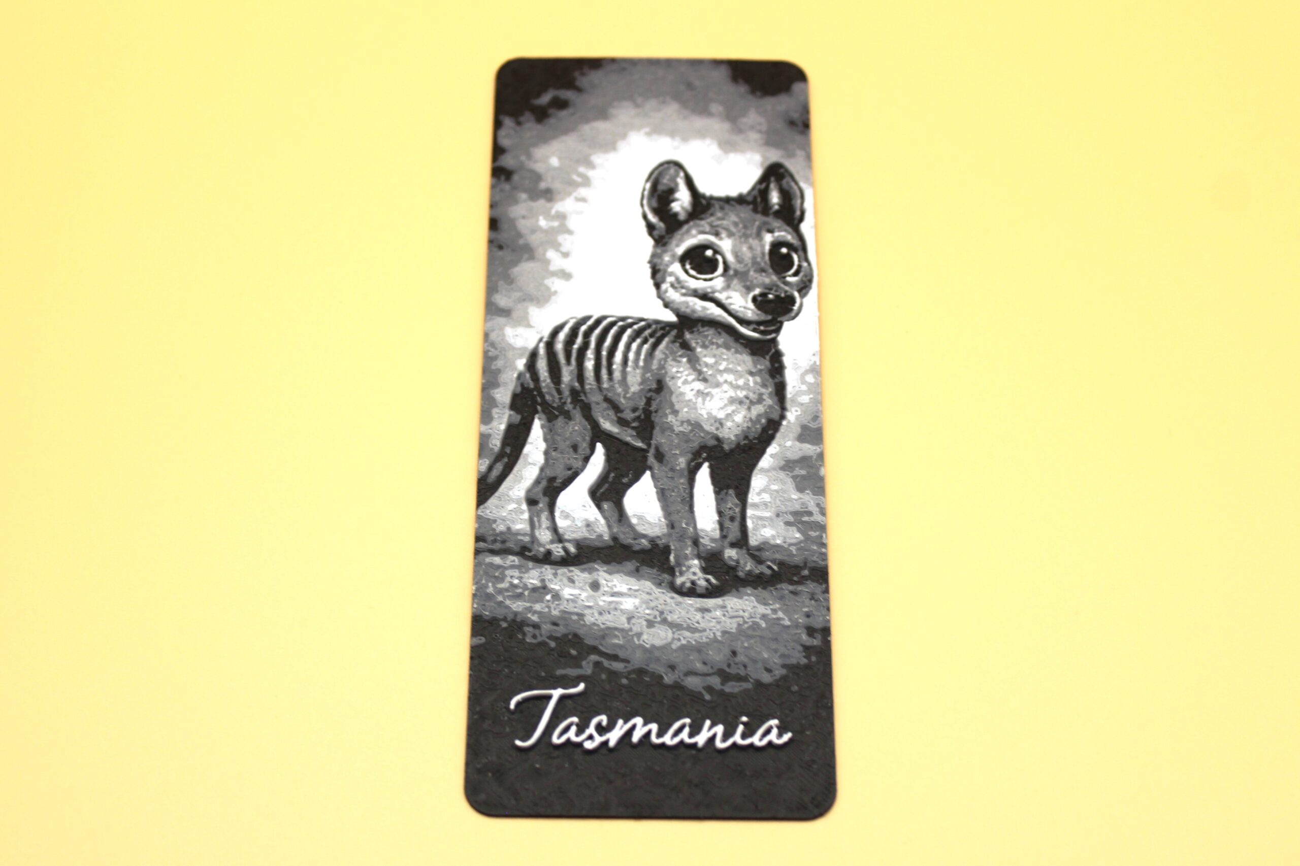 Introducing our new range of Tasmania Bookmarks, designed and manufactured in Deloraine, Tasmania. Please welcome this super cute Tasmanian Tiger Bookmark. These amazing Tasmanian Bookmarks have been designed digitally by us, then crafted in a special design studio that can replicate the image into 3D design using data around the opacity or transparency of filament from the extensive Squiz 3D filament library. In short, it takes many programs to be able to create these beautiful Bookmarks. Like the Tasmanian Tiger flexi toys, Tasmanian Tiger Bookmarks were the highest on my list of designs, so I’ve done the best I can do to bring this beautiful mammal out of extinction, and into your hearts and homes. It was only natural that our beloved Tassie Tiger be first and foremost in our new product range of Bookmarks that will be dedicated to Tasmanian Fauna and Flora. Please welcome the Tasmanian Tiger Bookmark to our product range, and grab this beautiful ‘Thylacine’ Bookmark today!